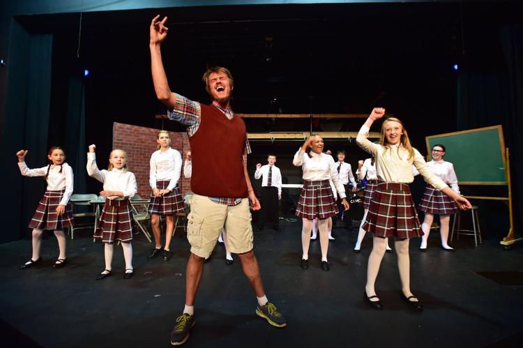 The cast of "School of Rock: The Musical" screams, "Stick it to the man!" during a dress rehearsal at NOVA Center for the Performing Arts.