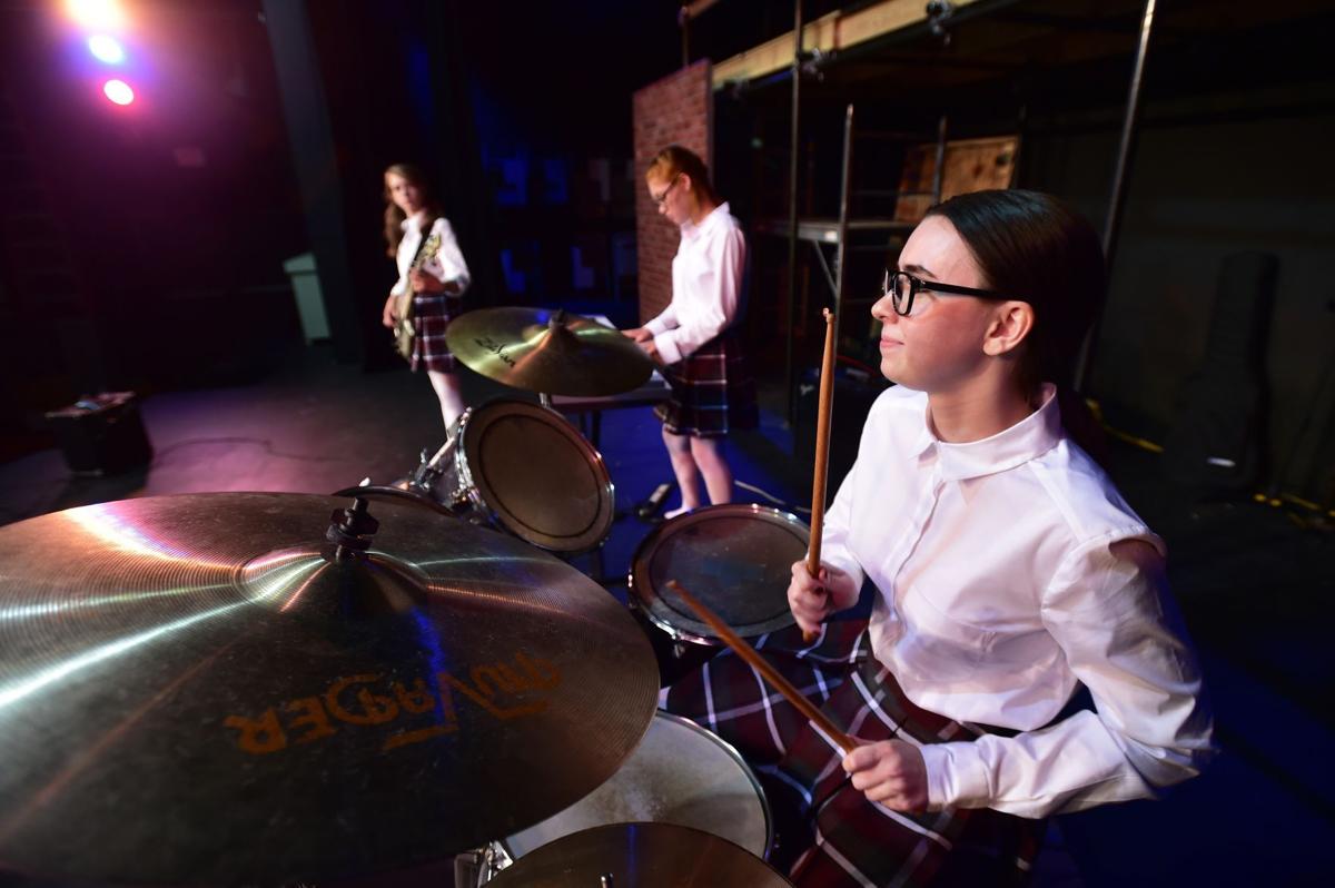 Grace Hodges drums as the cast plays "School of Rock" during a dress rehearsal for "School of Rock: The Musical" at NOVA Center for the Performing Arts on Thursday, July 14.