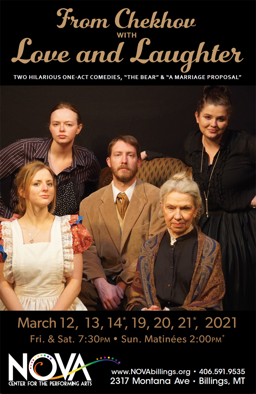 NOVA Center for the Performing Arts presents "The Bear" and "The Proposal" written by Anton Chekhov. Show dates are March 12th, 13th, 14th, 19th, 20th, and the 21st. Friday and Saturday shows will be at 7:30 pm and Sunday matinees will be at 2:00 pm. Directed by Mary Ann Connors, these two one-act comedies are filled with twists and turns.